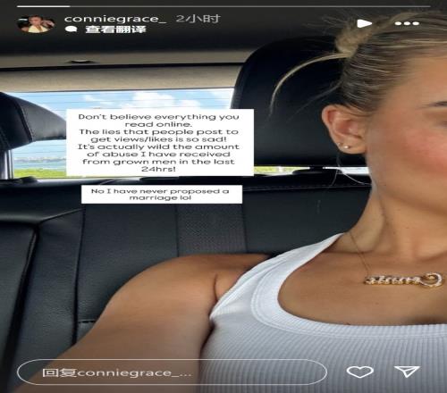 格蕾丝写道:“不要网上说什么你就信什么,人们为了博取浏览量或点赞而散布的谎言真是令人悲哀!过去24小时里,我竟然收到了这么多成年男性的辱骂,简直是疯了!不,我从没求婚。”