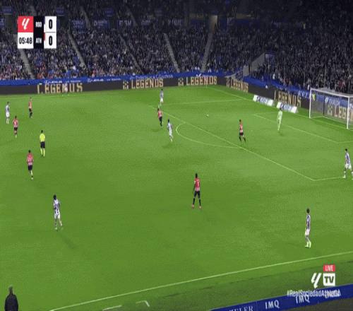 在下一个对阵毕巴的例子中,祖比门迪的表现更具穿透力。他拉边接应边后卫哈马里-特拉奥雷的传球,这一跑动对帮助皇家社会摆脱激进的人盯人压迫至关重要。