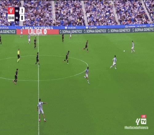 例如,下面这个对阵瓦伦西亚的案例中,就很好诠释了祖比门迪的作用:这位26岁的西班牙国脚在组织阶段先是在两名前锋身后伺机,随后移动到接球位置。祖比门迪他无需大费周章就为自己创造了接球空间。得球后,他一次短促的加速便甩开了对手哈维-格拉和乌戈-杜罗,随后将球塞给塞尔吉奥-戈麦斯,后者转身接球,使进攻得以延续。