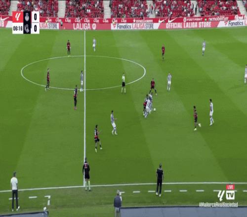 下面,对阵马洛卡的案例中展示了祖比门迪如何迅速调整自己脚下动作,以摆脱对手防守困境:他与卢卡-苏契奇完成一次快速的二过一,随后用左脚控球,接着将球捅传给边后卫穆尼奥斯。在通过层层防线推进球权后,他随进攻向前移动,最终用一记挑传找到了插向身后的边锋巴雷内切亚。