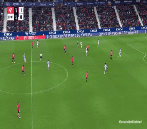 下面则是祖比门迪帮助球队提速推进的又一例证。在这场客战奥萨苏纳的比赛中,祖比门迪回撤接球,并用一脚触球传球穿透了中场防线。