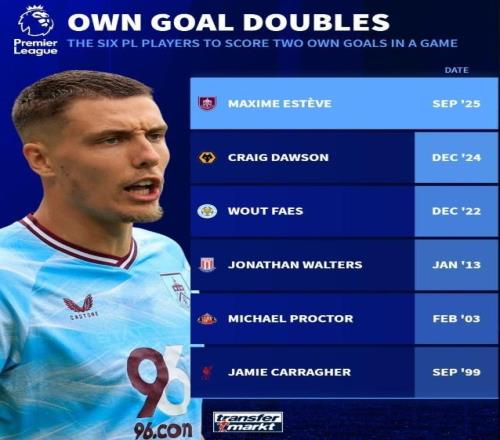 在英超赛场上,除了艾斯特福外,还有一些“倒霉蛋”单场乌龙双响,他们是克雷格-道森(狼队)、法斯(莱斯特城)、沃尔特斯(斯托克城)、普罗克特(桑德兰)和卡拉格(利物浦)。
