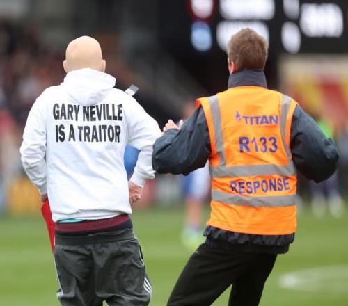 两男子穿着印有“加里内维尔是叛徒”的衣服,冲入英乙赛场
