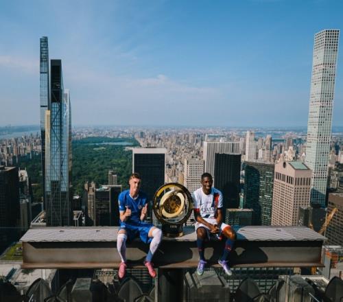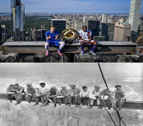 帕尔默、登贝莱在洛克菲勒中心楼顶与世俱杯奖杯合影,致敬知名照片“大厦之巅的午餐”,为决赛预热。