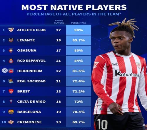 德转列本土球员占比最高球队:毕巴无悬念居首,皇社、巴萨在列