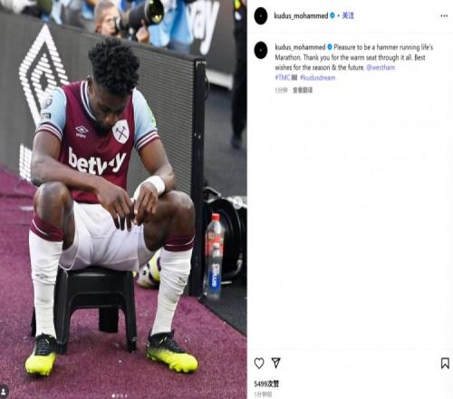 库杜斯晒出自己身披西汉姆球衣的照片并表示:"很荣幸能在人生马拉松的旅程中成为铁锤帮一员。也感谢你们始终给予的温暖港湾。祝新赛季与未来一切顺利。@西汉姆联"