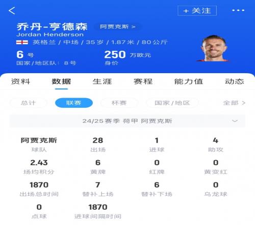 亨德森现年35岁,上赛季共为阿贾克斯出场45次,贡献1球6助攻。
