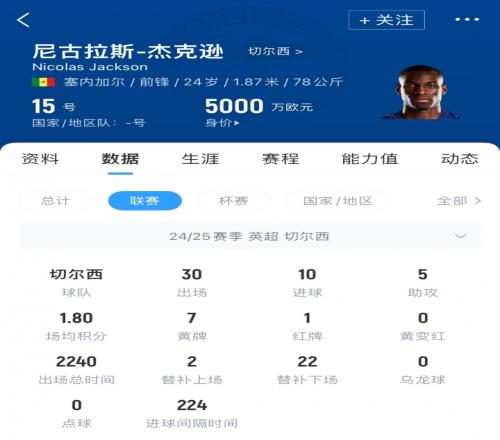 杰克逊现年24岁,24/25赛季代表切尔西各项赛事出战34场,打进13球贡献5次助攻,目前德转身价5000万欧。
