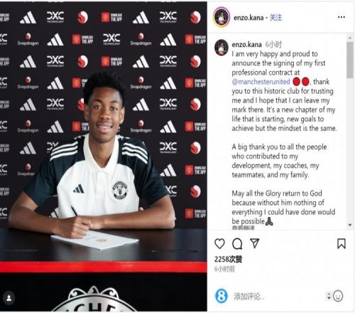 比伊克社媒:很自豪与曼联签下首份职业合同,希望在这里留下印记