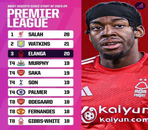 据Opta数据统计,自2023-24赛季以来,英超的助攻榜单中,萨拉赫以28次独占鳌头,维拉前锋沃特金斯21次排名第二,伊兰加20次排名第三。