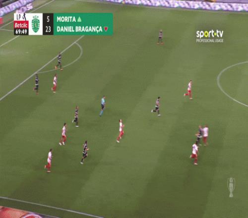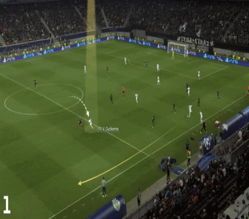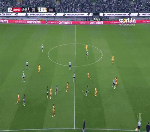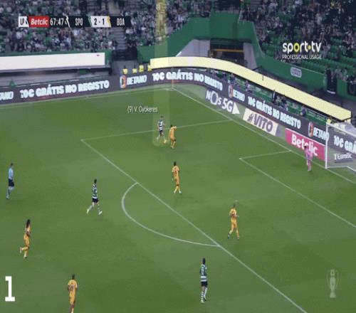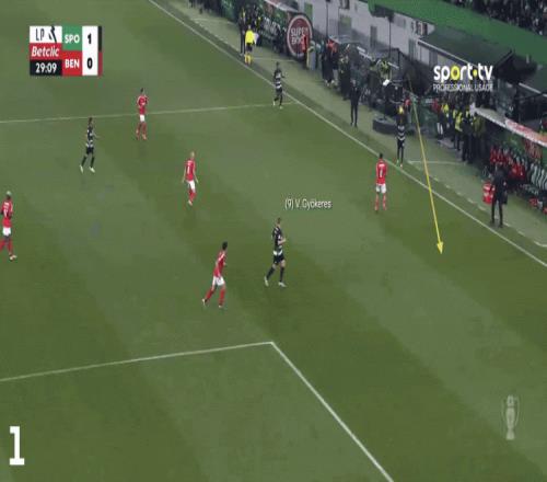 在一次快速的球权转换后,葡萄牙体育将球转移到左侧。约克雷斯毫不犹豫地启动,以全速前插,为队友提供了沿边线的传球选择。即使后卫能跟上,这种极端的跑动也会迫使他们进行盯人交接——中后卫通常不愿意跟着前锋横穿整个球场,进而导致自己完全失去位置。
