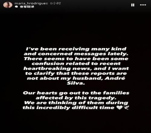 安德烈-席尔瓦妻子:“我最近收到了许多善意和关切的留言。似乎有些关于最近令人心碎的消息的混淆,我想澄清这些报道与我的丈夫安德烈-席尔瓦无关。我们对受这场悲剧影响的家庭表示深切同情。在这个无比艰难的时刻,我们挂念着他们。”