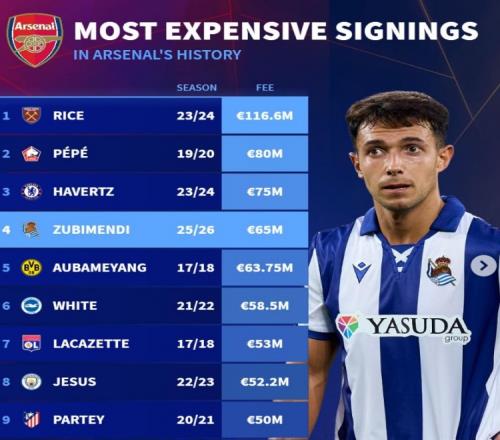 阿森纳队史引援花费榜:赖斯1.166亿欧居首,祖比门迪第四