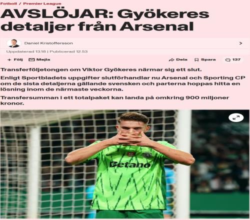 报道称,约克雷斯的转会肥皂剧即将落幕。阿森纳和葡体即将敲定协议,约克雷斯将转会至阿森纳,目前两家俱乐部仅剩最终几个细节还需谈判。双方希望在未来几周内达成协议,预计转会费总额为9亿瑞典克朗(约合8000万欧)。