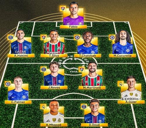 体育资讯7月6日报道宣称 世俱杯1/4决赛全部战罢,官方评选的最佳阵容出炉,姆巴佩、杜埃领衔锋线,帕尔默、若昂-内维斯等人在列。