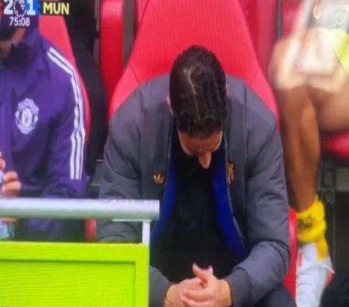 在对阵布伦特福德的下半场比赛,姆伯莫赢得了点球机会,可惜B费罚丢了这一次扳平比分的机会,罚点前镜头给到阿莫林,他仍旧不敢看点球,坐在教练席低着头。
