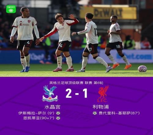 北京时间9月27日,英格兰足球超级联赛第6轮展开较量,水晶宫坐镇主场迎战利物浦。上半场,赫拉芬贝赫乌龙助攻萨尔门前包抄破门,赫拉芬贝赫暴射被扑后中柱,阿利松奉献三次神扑,马特塔不停球远射中柱;下半场,基耶萨抓住对方解围失误抽射破门扳平,补时阶段恩凯蒂亚破门上演绝杀。最终全场比赛结束,水晶宫以2比1战胜利物浦,收获宝贵三分。