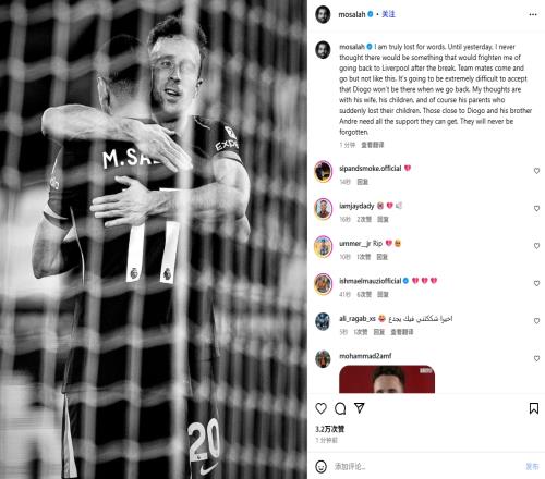 体育资讯07月04日报道宣称 昨日,28岁利物浦前锋若塔因为车祸不幸离世,今日队友萨拉赫社媒悼念若塔!