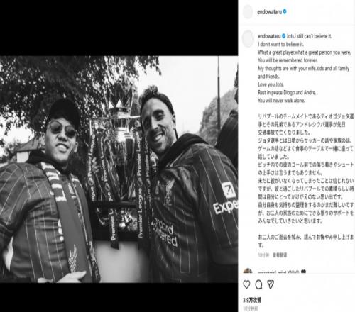 远藤航告别若塔:至今不敢相信也不愿相信,你永不独行