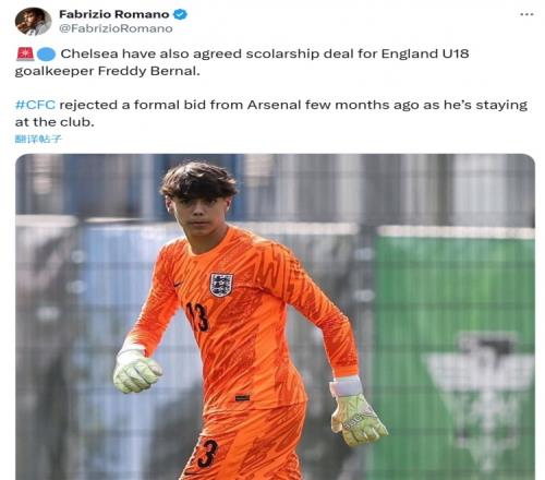 体育资讯7月4日报道宣称 记者罗马诺报道,切尔西于英格兰U18门将弗雷迪-伯纳尔达成奖学金协议。