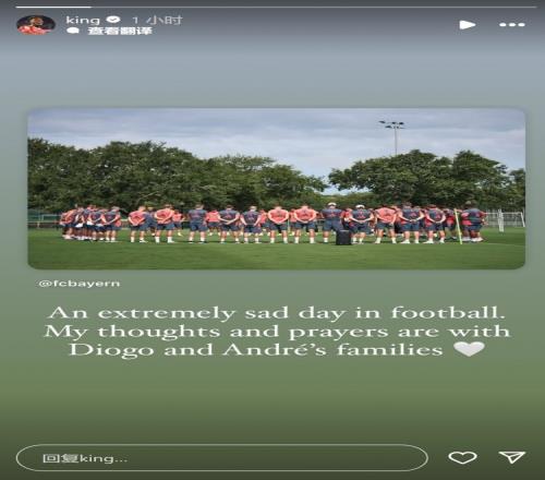 科曼社媒晒出拜仁全队默哀的照片,并写道:“足球世界极其悲伤的一天,我的思念和祈祷与迪奥戈和安德烈的家人同在。”