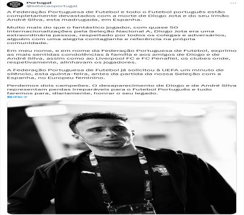 遗憾的是,这样“愤怒”没能够转化成逆转的“动力”,在天空体育、葡萄牙媒体跟进后,葡足协发布公告证实这则消息属实,斯洛特更新了社媒对若塔表达了悼念,就此,确定成真,若塔永远的告别了我们。