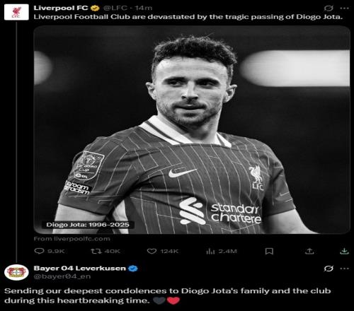 勒沃库森官推写道:“在此心碎时刻,向迪奥戈-若塔的家人及利物浦俱乐部致以最深切的哀悼。