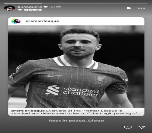 阿圭罗社媒转发英超关于若塔去世的动态,配文:“安息吧,迪奥戈。”