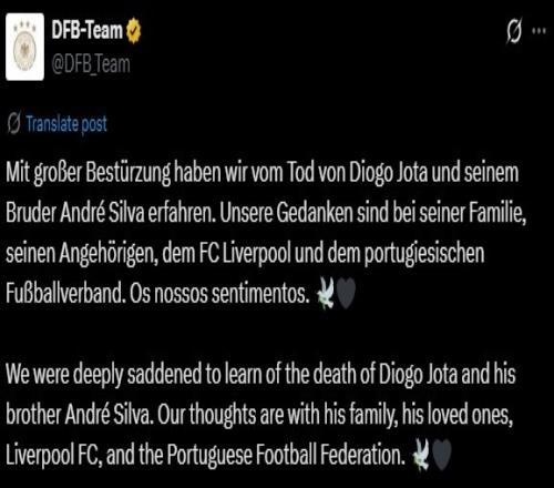 德国足协:我们的心与若塔家人、亲友、利物浦及葡萄牙足协同在