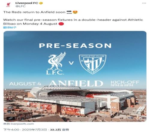 西媒发布相关消息的同时,利物浦官方社媒在北京时间16点整发布了与毕尔巴鄂竞技季前赛的预告,目前利物浦方面暂未确认若塔的消息。
