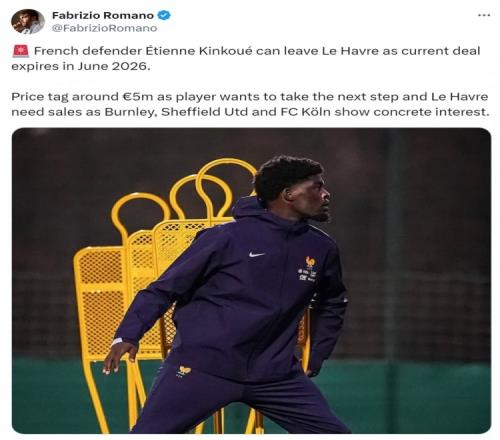 罗马诺:勒阿弗尔中卫金库可能离队&标价500万欧,伯恩利等队有意