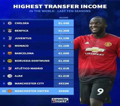 德转列近十年卖人收入榜:切尔西压本菲卡居首曼城第9、曼联第32