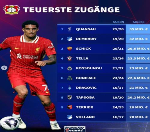 体育资讯7月3日报道宣称 利物浦中卫宽萨已经官宣转会勒沃库森,《转会市场》统计显示他也是药厂队史标王。