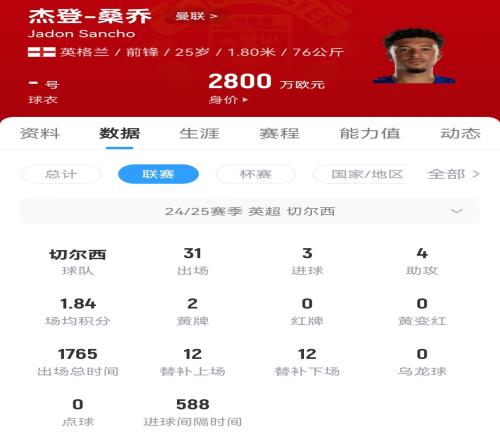 25岁的桑乔上赛季被曼联租借至切尔西,为蓝军在英超出场31次贡献3球4助,球员目前的德转身价为2800万欧元。今夏桑乔租借期满返回曼联,据报道曼联希望将球员出售。