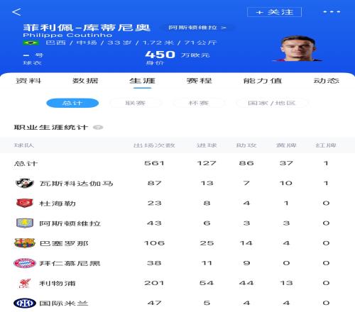 库蒂尼奥2018年以1.35亿欧转会费加盟巴萨,当时库蒂尼奥效力巴萨后的巅峰身价高达1.5亿,如今库蒂尼奥身价一降再降,仅有450万欧。