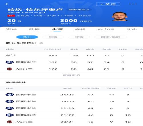 恰尔汗奥卢现年31岁,2021年夏窗自由身从AC米兰加盟国际米兰,目前身价3000万欧元。