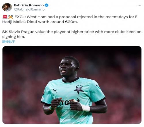 罗马诺透露,西汉姆对布拉格斯拉维亚20岁中场迪乌夫感兴趣,提出了约2000万欧元的报价,但遭到布拉格斯拉维亚的拒绝,布拉格斯拉维亚对迪乌夫的估价更高,而且有更多俱乐部希望签下他。