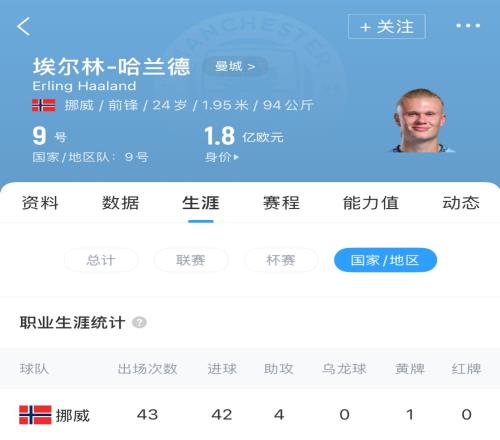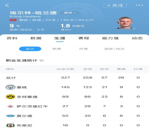 24岁的哈兰德生涯至今共出战370场正式比赛,攻入300粒进球,其中俱乐部327场258球,国家队43场42球。总计场均0.81球。