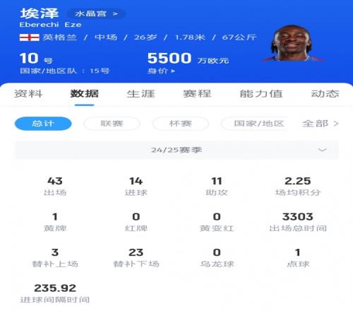 热刺也在关注埃泽的动向,球员与水晶宫的合同中包含一则价值6800万英镑的解约金条款。