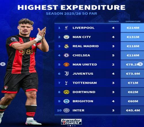 德转列夏窗至今引援花费榜:利物浦4人2.14亿欧居首,曼城次席