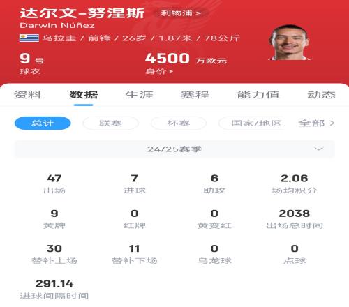 现年26岁的努涅斯上赛季在利物浦共出场47次,贡献7球6助,目前德转身价为4500万欧元。