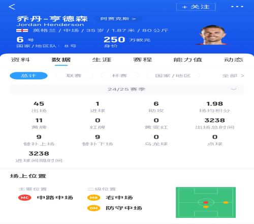 阿贾克斯队长亨德森现年35岁,他与球队的合同只剩最后12个月。本赛季他为阿贾克斯各项赛事出场45场,取得了1粒进球和6次助攻,目前其德转身价为250万欧。