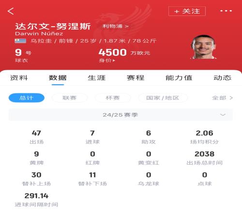 利物浦在2022年购买努涅斯时,花费了8500万欧元,当时创造了俱乐部队史引援纪录,而这一纪录在今夏也被维尔茨打破。