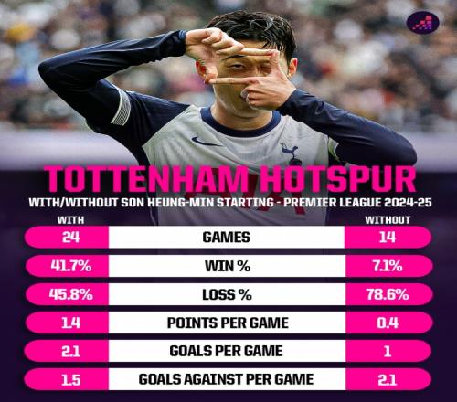 热刺前锋孙兴慜首发与否影响对比(2024-25赛季英超)