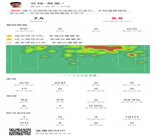 另外,努里有92次触球,59次传球,传球成功率94.9%,送出6次传中,1次长传。