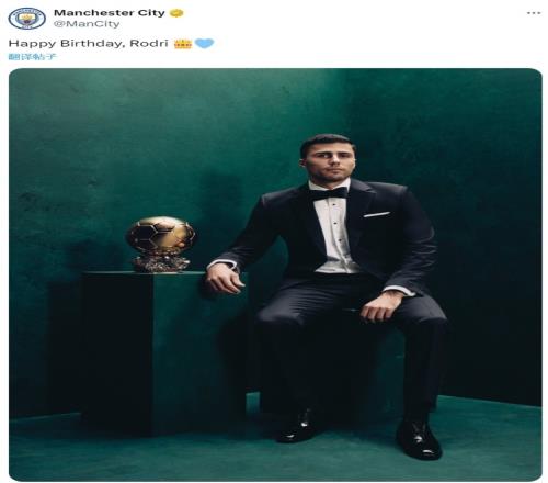 曼城官方社媒晒出罗德里与金球奖杯的合照,配文:“生日快乐,罗德里。”