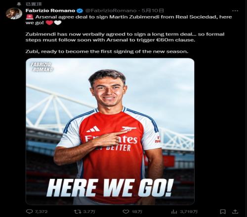 枪迷们下树罗马诺确认祖比门迪即将官宣,并把置顶换成球员HWG