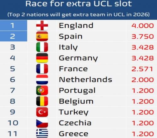 在赛季尚未开始之际,英格兰已经累积了4分的国家系数积分。这主要得益于他们六支参加欧冠的球队每队获得了6个额外积分,总共36分,平均分配给九支球队后,每队获得4分。而西班牙则将以第二名的位置开启新赛季,并同样有望获得一个额外的欧冠席位。