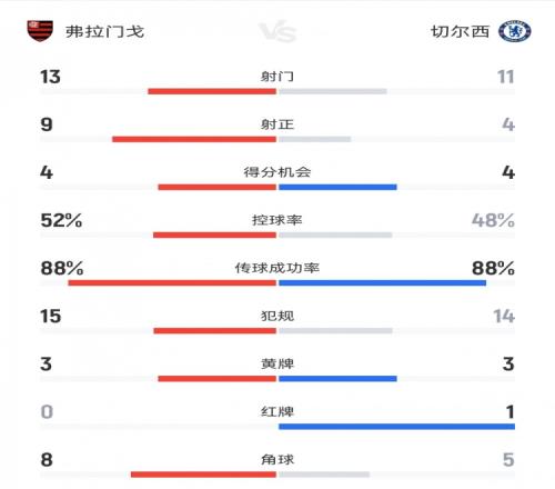 切尔西13弗拉门戈数据:射门1113,射正49,得分机会44
