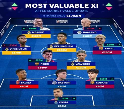 体育资讯6月21日报道宣称 德转近期对各联赛球员身价进行了更新,同时列出了当前身价最贵阵容,哈兰德、姆巴佩领衔锋线,维尼修斯、亚马尔在列,总身价14.6亿欧。